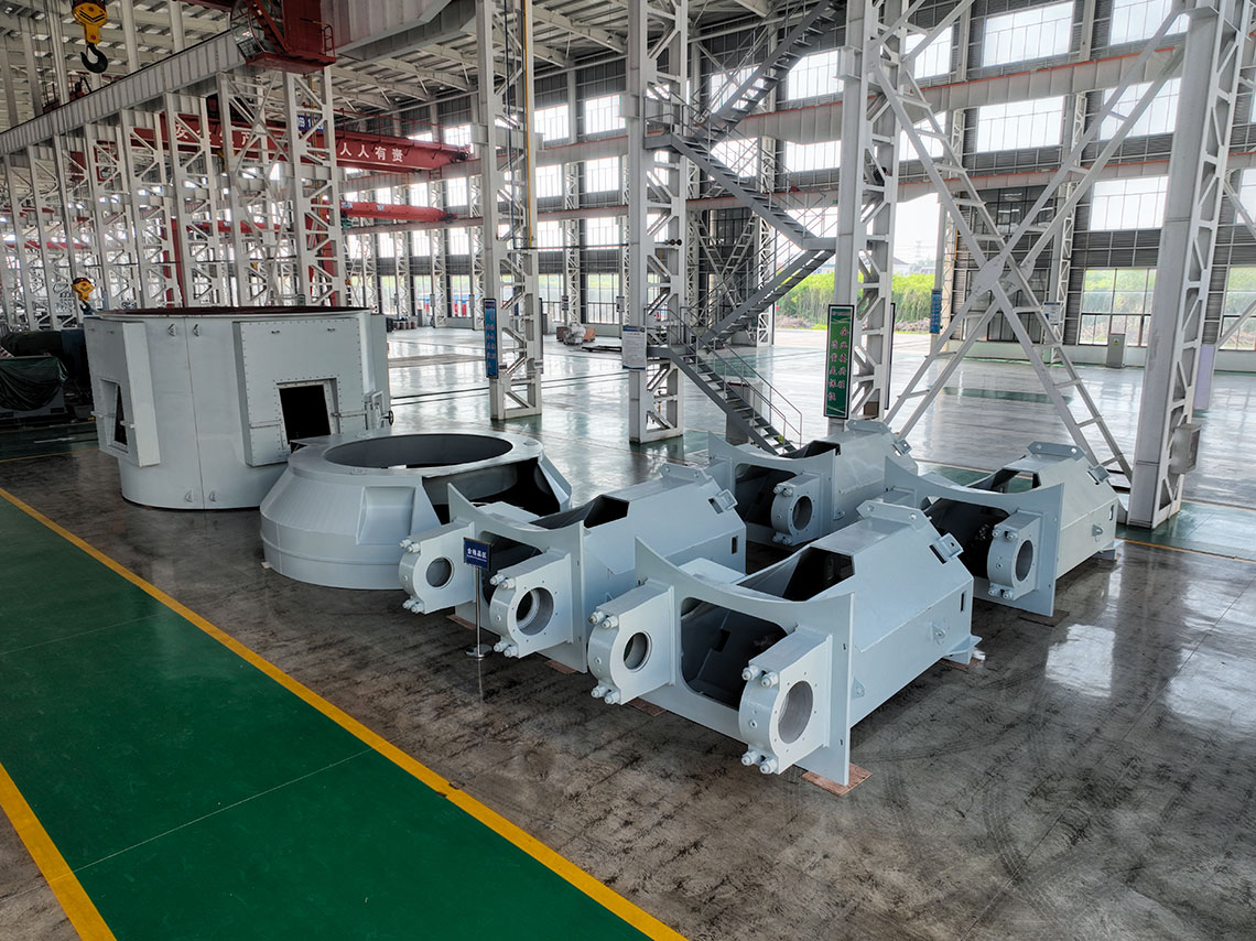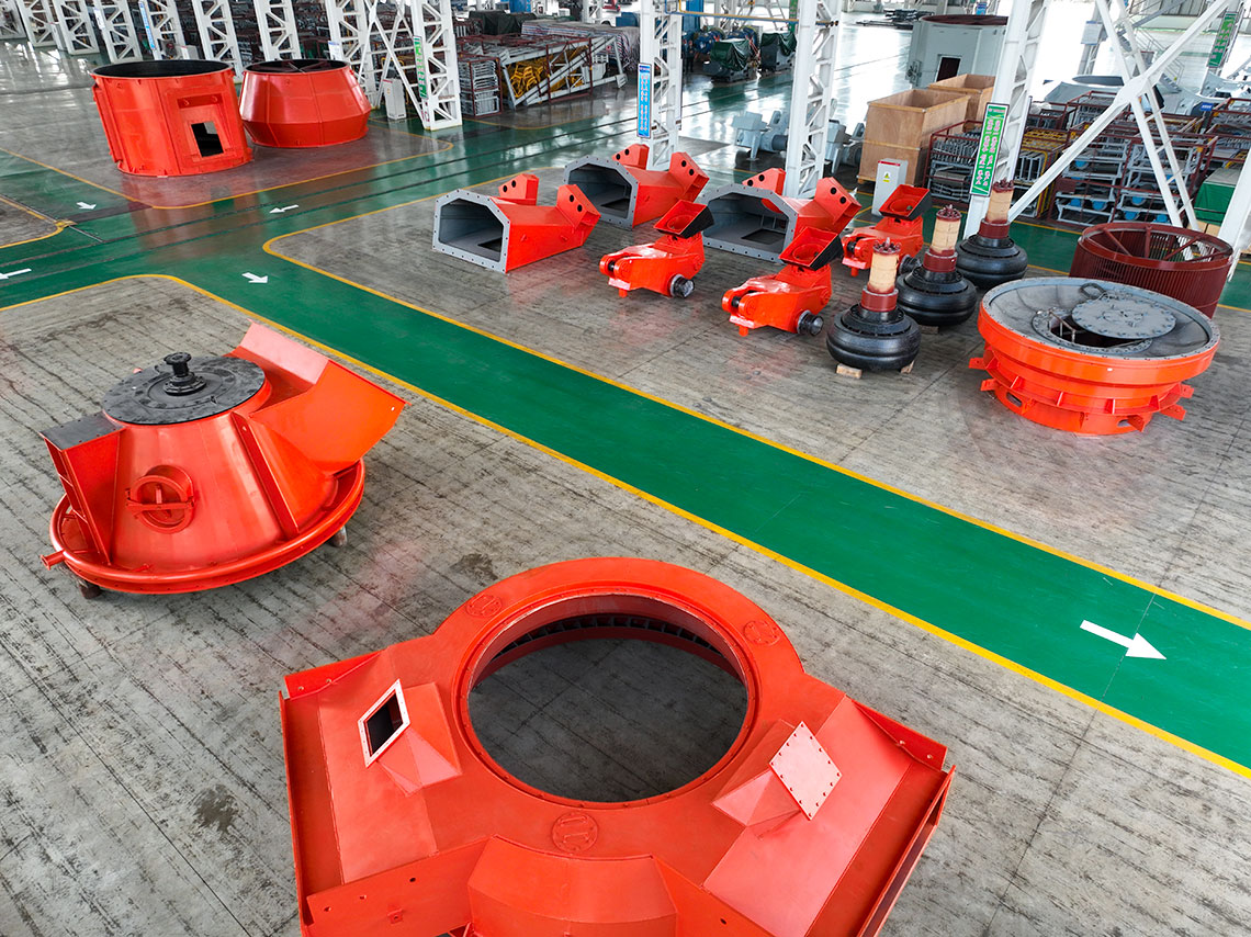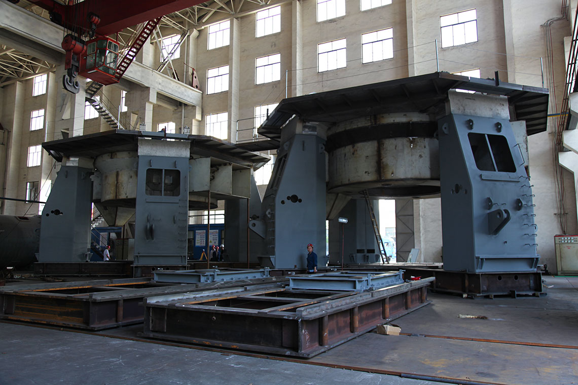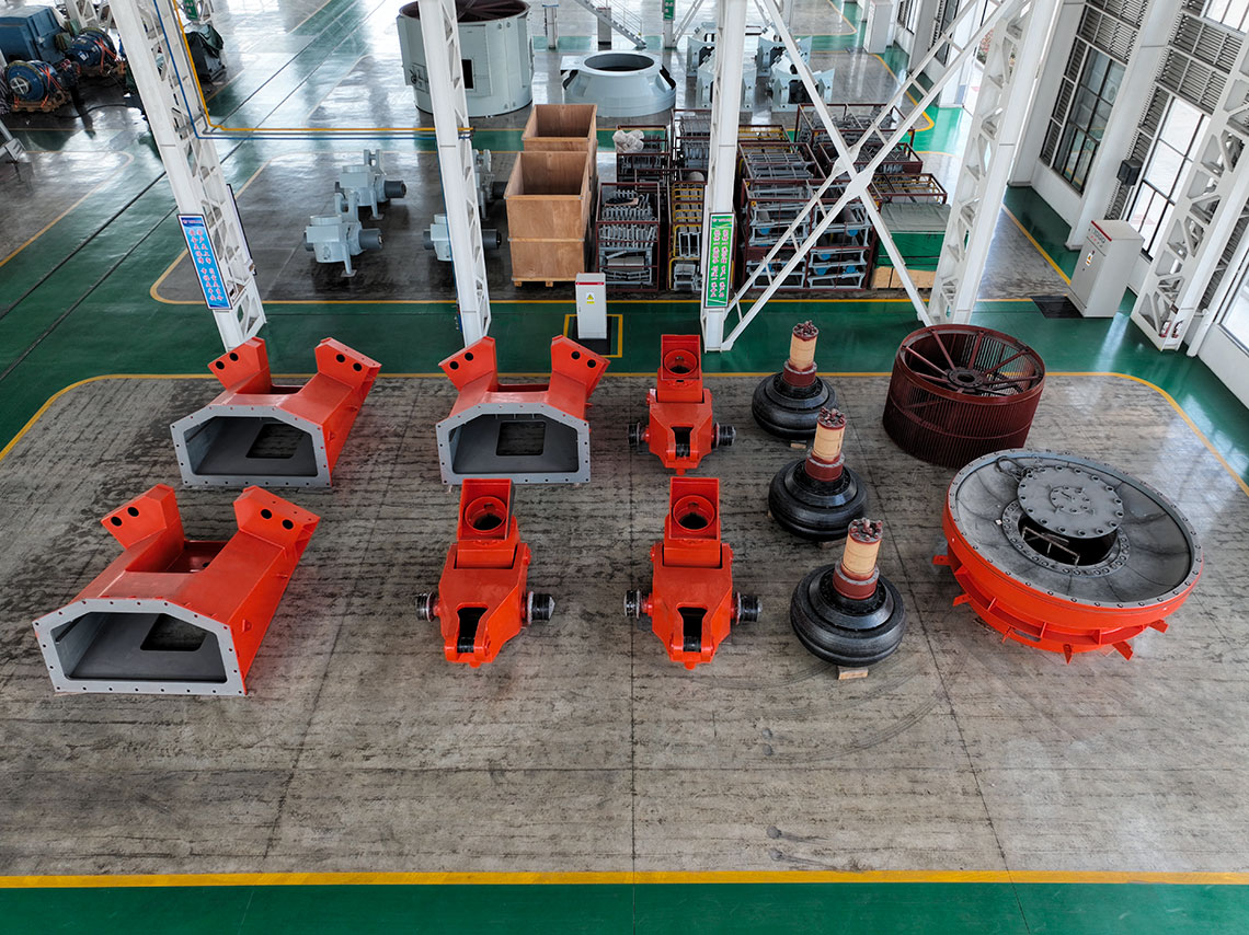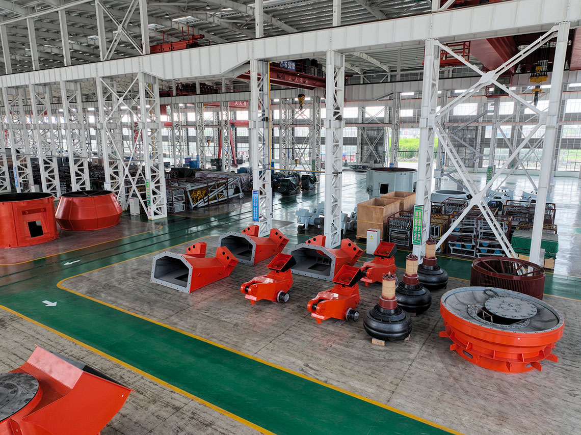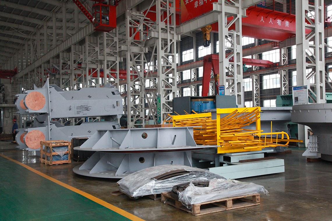磨煤機(jī)三個(gè)磨輥由旋轉(zhuǎn)的磨盤帶動(dòng)進(jìn)行碾磨作業(yè)。入磨物料經(jīng)中心落煤管落在磨盤上后,由旋轉(zhuǎn)磨盤產(chǎn)生的離心力將其輸送至碾磨輥道上碾磨。碾磨壓力由彈簧或液壓加壓裝置產(chǎn)生,通過靜定的三點(diǎn)系統(tǒng),碾磨力均勻地傳至三個(gè)磨輥,通過加壓系統(tǒng)壓力傳至基礎(chǔ)。煤粉的干燥和輸送利用熱風(fēng)來進(jìn)行。熱風(fēng)通過噴嘴環(huán)均勻分布于磨盤四周,將經(jīng)碾磨的物料干燥并輸送至磨機(jī)上部的分離器。物料的粗細(xì)粉在此分離,細(xì)粉排出磨機(jī),粗粉重新返回磨內(nèi)碾磨。物料中的一些不可破碎物可通過磨機(jī)下部的排碴口排出。磨煤機(jī)主要由基礎(chǔ)部,減速機(jī),下架機(jī),中架機(jī),磨盤,磨輥,加壓裝置,分離器,正壓風(fēng)密封裝置,蒸汽吹掃裝置等部件組成,還配有主電動(dòng)機(jī),潤滑油站,液壓站和密封風(fēng)機(jī)等附屬設(shè)備,另備有慢速傳動(dòng)裝置,安裝檢修專用工具,扶梯平臺(tái),煤粉分配器,速斷閥等配套設(shè)備供用戶選用。磨煤機(jī)采用液壓加壓系統(tǒng),在運(yùn)行中即可對(duì)粉磨壓力進(jìn)行調(diào)整,并具有更好的過鐵保護(hù)性能。在原標(biāo)準(zhǔn)型的基礎(chǔ)上增加了磨輥翻出裝置,并提高了磨體的抗爆能力。